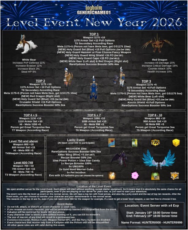 The Lucky Event Winners are known! ev4_SUMMER8989 Misty Weapon, Armor, T7, Meta Token 2ea ev4_SUMMER7777 Rareoption Success Booster 30% 5ea ev4_SUMMER0707 10ea Power Potion + 10ea Star Candy ev4_SUMMER1374 Dragon Knight Fancy Weapon ev4_SUMMER5005 Event Cape 6 +10 (4610 def) ev4_SUMMER7590 2x Gold Nord Warrior Cube ev4_SUMMER2505 1x Recipe Booster 100% ev4_SUMMER0123 Succubus of Seduction ev4_SUMMER2344 5x UW100% ev4_SUMMER9669 Centaur Congratulations to the winners, the rewards will be sent to your E-Trader shortly! Video of the draw: